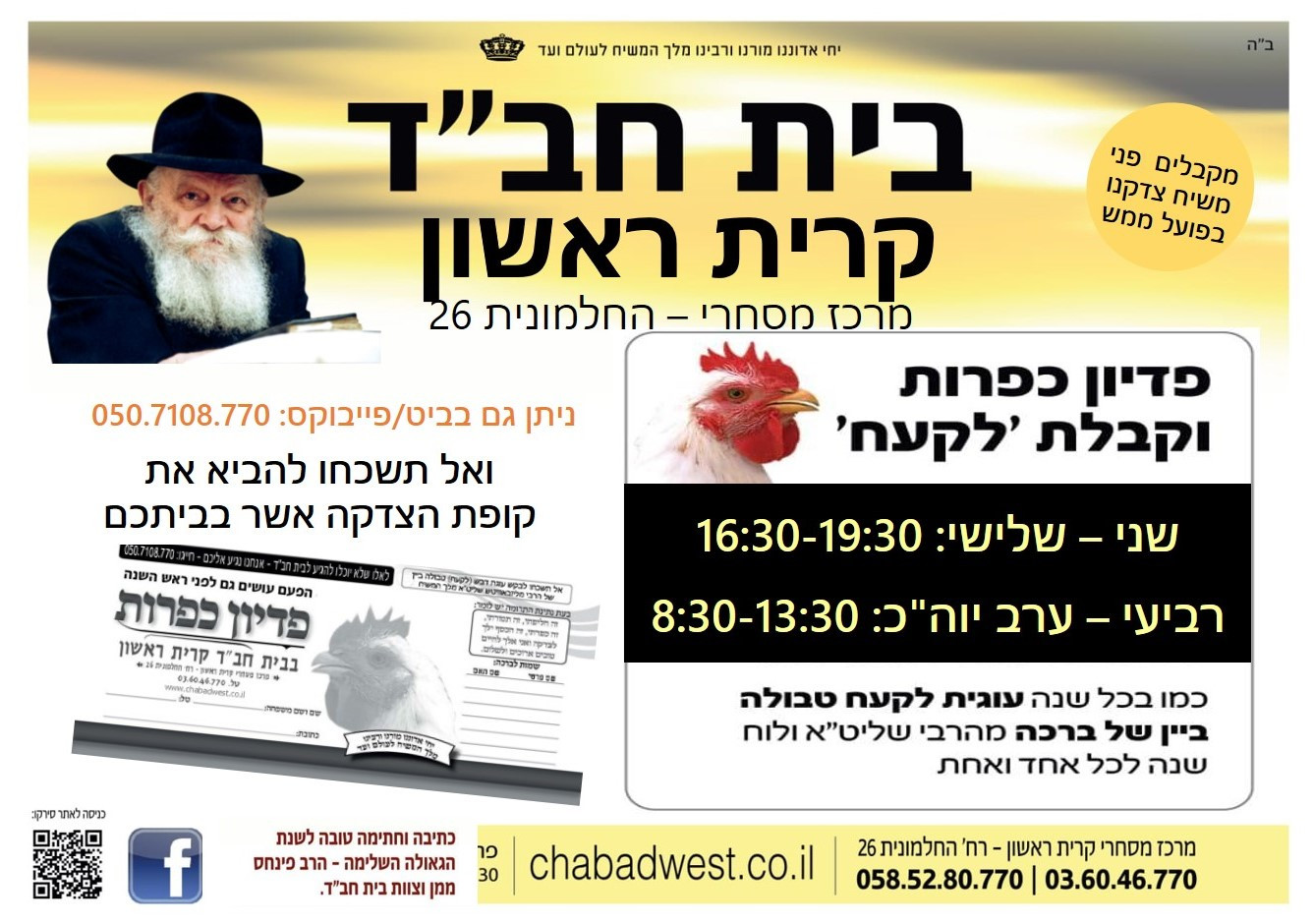 ולערוך את פדיון כפרות ולקבל לקעח ולוח שנה - פתוח כל יום עד 19:00 ובערב החג עד 13:00